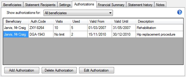 This tab allows you to maintain a table of authorizations for beneficiaries of