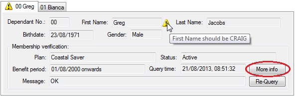 Certain medical aids will also provide additional information. If you see a More info button (see picture, circled in red) then clicking the button will display additional information about the patient's medical aid plan.
