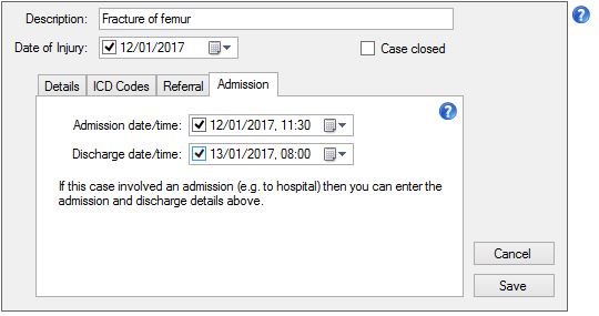 If the patient was admitted to a hospital (or hospice) you can capture the admission and discharge dates and times on this tab.
