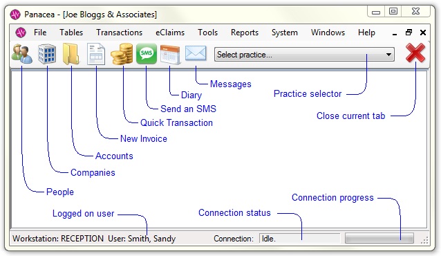 Panacea's main window is shown below. Click on items on the window for