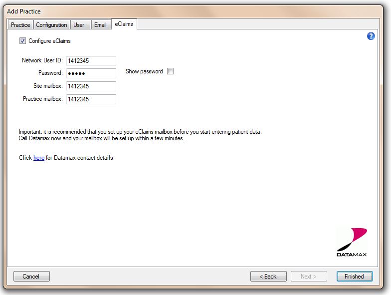 are provided on the eClaims tab (see Click here for Datamax contact
