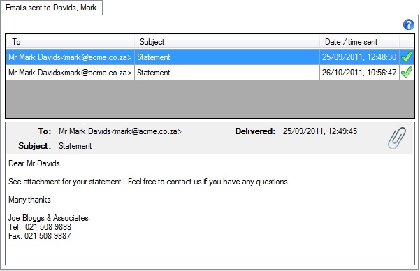 This tab displays emails that were sent to a
