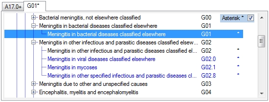 Codes that can be used as asterisk codes are indicated with a * sign to the right of the ICD code. When you select an asterisk code a