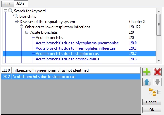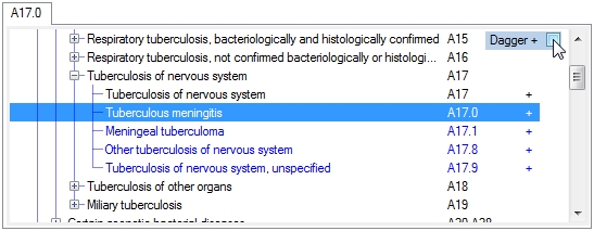 Codes that can be used as dagger codes are indicated with a + sign to the right of the ICD code. When you select a dagger code a checkbox