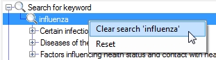 If you right-click on an item in ICD tree (the top part) a context menu will be displayed (see right). This enables you to clear previous searches or to reset the browser. Resetting removes all searches and selections and sets the browser to it's original blank state. |