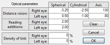 When a code is used that requires optical parameters (e.g. an optometry code that requires a lens prescription) a